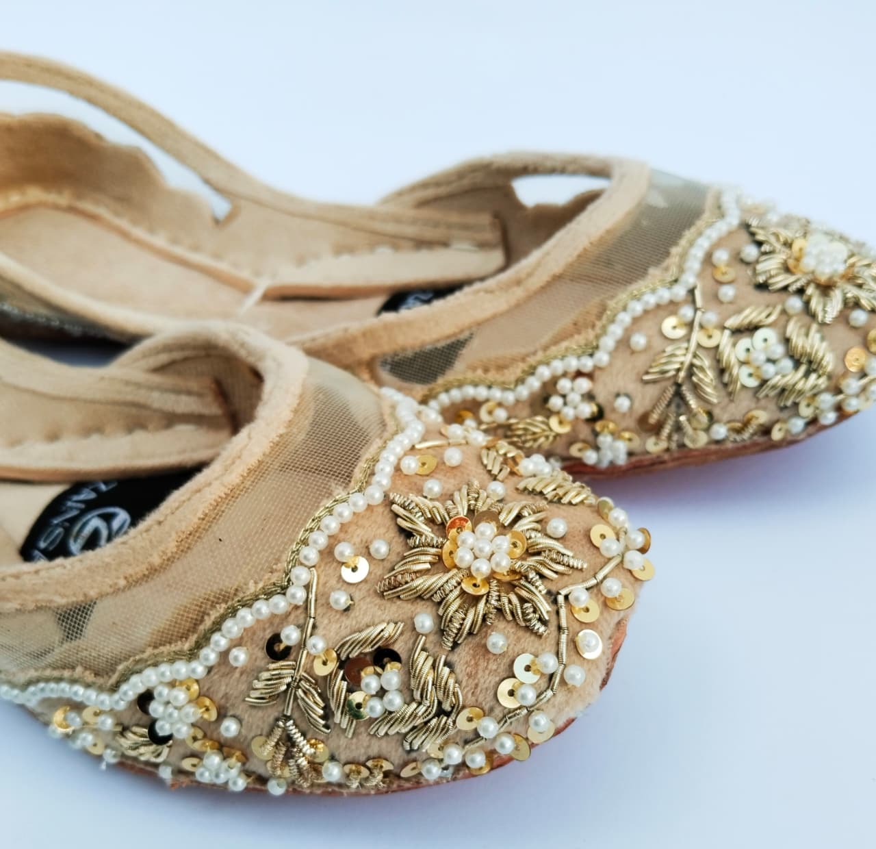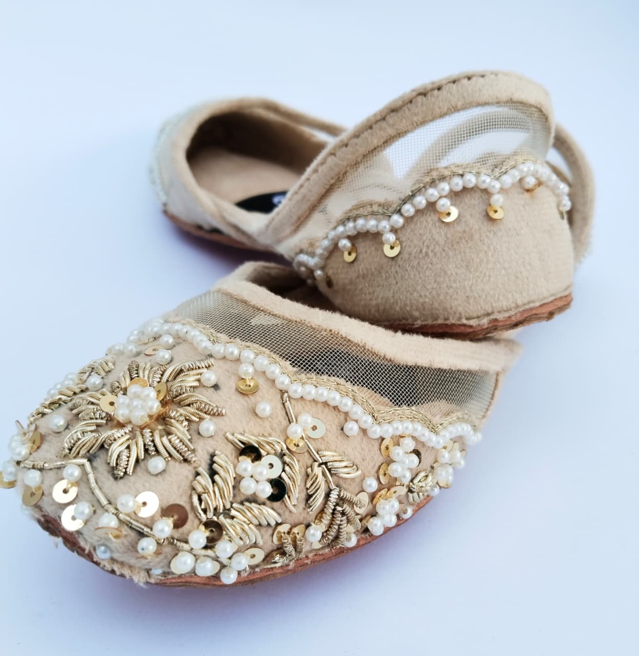 Crafted with **pure leather sole** for long-lasting comfort and durability, this khussa features luxurious **skin velvet** beautifully adorned with intricate **hand-done Naqshi embroidery** in golden tones.